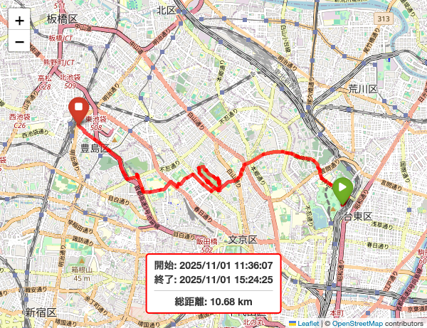 移動サマリー 写真に記録されたGPS情報に基づき、2025/11/01 11:3 続きを読む 2025年11月01日の散歩記録→