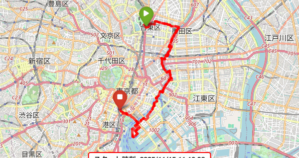 移動サマリー 写真に記録されたGPS情報に基づき、2025/11/15 11:1 続きを読む 2025年11月15日の散歩記録→